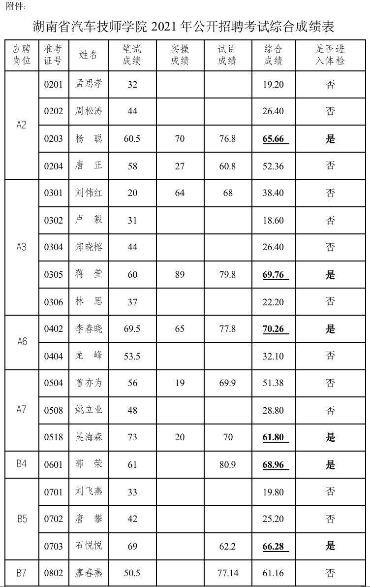 根據(jù)《湖南省汽車技師學(xué)院2021年公開招聘公告》及《湖南省汽車技師學(xué)院2021年教師公開招聘工作實(shí)施方案》要求,湖南省汽車技師學(xué)院公開招聘筆試、實(shí)操、試講工作已經(jīng)結(jié)束,按照招聘崗位計(jì)劃與綜合成績(jī)1:1的比例確定入圍體檢及考察人員名單,現(xiàn)將入圍體檢及考察人員名單予以公示,若體檢或考察不合格,取消錄用資格,并按綜合成績(jī)排名遞補(bǔ)一次。