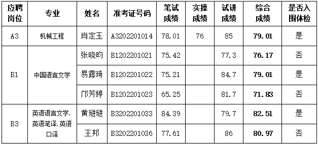 根據(jù)《湖南省汽車技師學(xué)院2022年公開(kāi)招聘公告》及《湖南省汽車技師學(xué)院2022年教師公開(kāi)招聘工作實(shí)施方案》要求,湖南省汽車技師學(xué)院公開(kāi)招聘筆試、實(shí)操、試講工作已經(jīng)結(jié)束,按照招聘崗位計(jì)劃與綜合成績(jī)1:1的比例確定入圍體檢及考察人員名單,若體檢或考察不合格,取消錄用資格,并按綜合成績(jī)排名遞補(bǔ)一次。現(xiàn)將入圍體檢及考察人員名單公示如下: