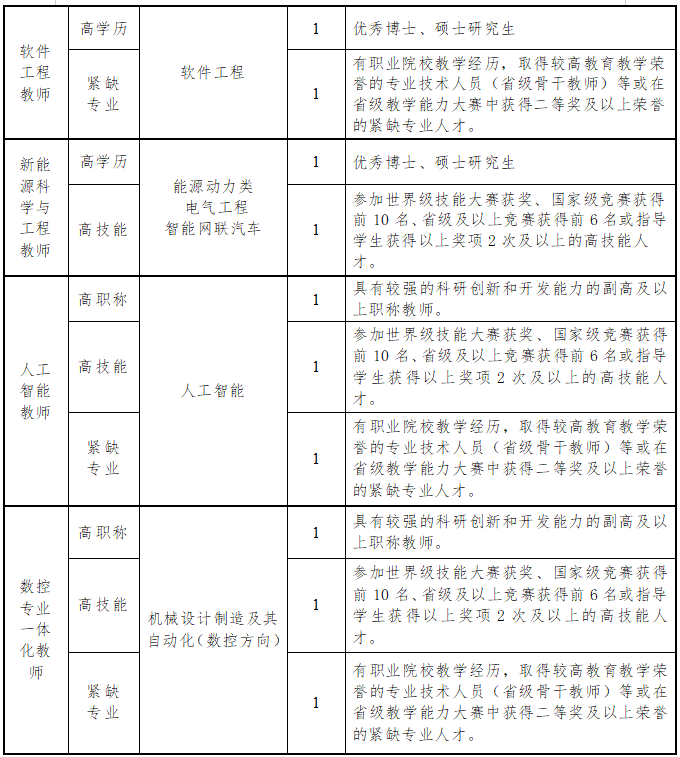 (四)緊缺專業(yè)人才:全日制本科及以上學(xué)歷,緊缺專業(yè)所需的,有職業(yè)院校教學(xué)經(jīng)歷,取得較高教育教學(xué)榮譽(yù)的專業(yè)技術(shù)人員(省級(jí)骨干教師等);或在省級(jí)教學(xué)能力大賽中獲得二等獎(jiǎng)及以上榮譽(yù);或取得市級(jí)及以上“勞動(dòng)模范”、“XX工匠”等榮譽(yù)稱號(hào)的。