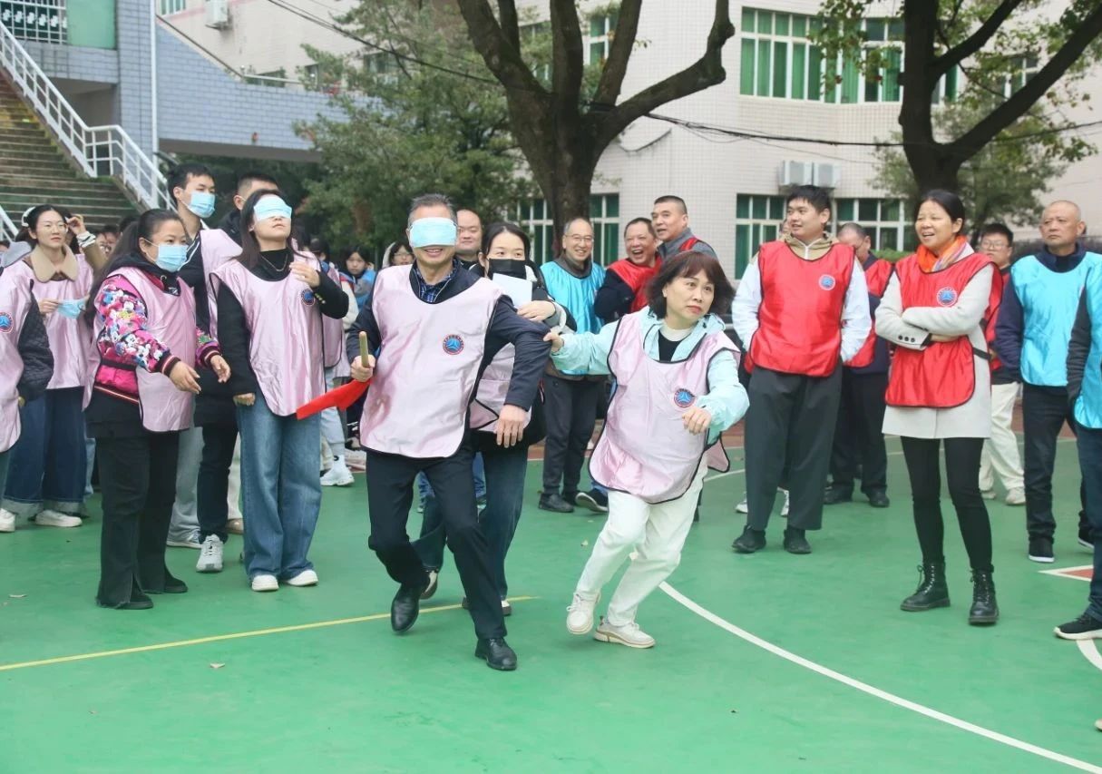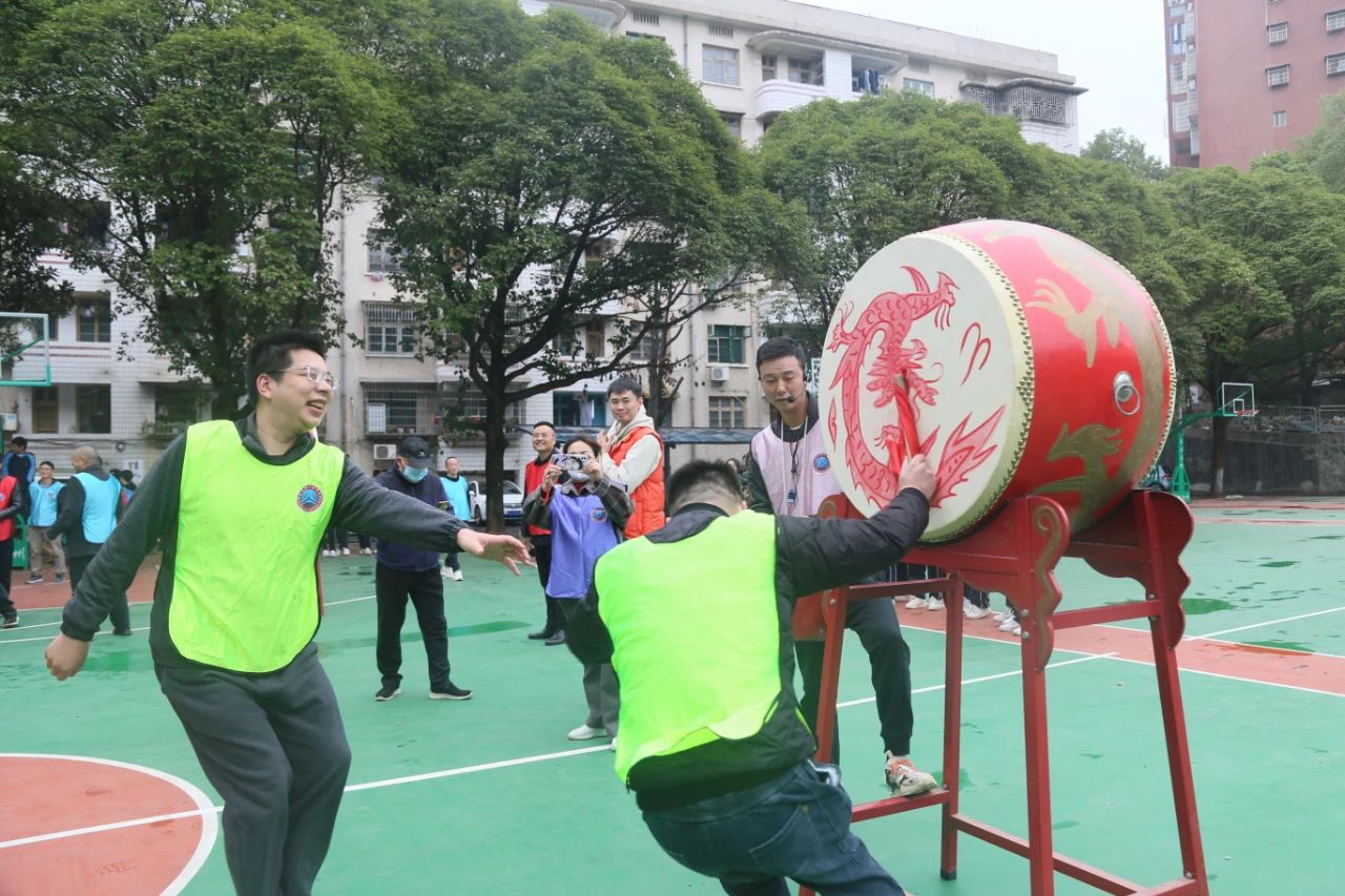 “蒙眼擊鼓”比賽為10人一組參賽,蒙眼后轉(zhuǎn)兩圈走到6米外擊鼓。比賽以小組對決的形式展開。隨著裁判的一聲令下,各小組參賽選手們轉(zhuǎn)圈后一沖而上,而觀賽的老師們則站在場外不停地為自己小組成員加油助威,整個活動現(xiàn)場氣氛熱烈,充滿激情,吶喊聲、歡笑聲響成一片。