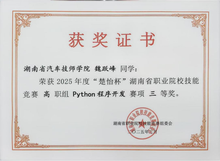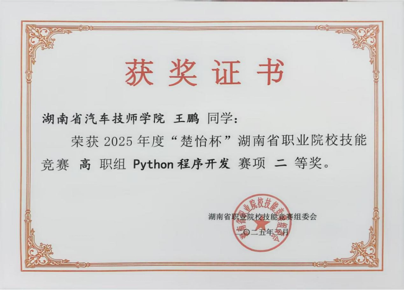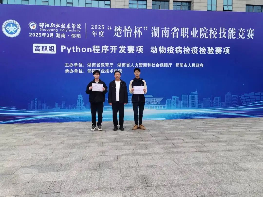 3月23日,2025年湖南省“楚怡杯”職業(yè)院校技能競賽高職組Python程序開發(fā)賽項在邵陽職業(yè)技術學院舉行,我院選手王鵬、魏躍峰與來自全省高職院校的226名大學生同臺競技,王鵬獲二等獎,魏躍峰獲三等獎。