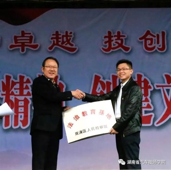 雙清區(qū)人民檢察院檢察長(zhǎng)伍順亮同志出席并宣讀《關(guān)于將湖南省汽車(chē)技師學(xué)院設(shè)立為雙清區(qū)法治教育基地的決定》;副院長(zhǎng)劉煬燁同志宣讀《關(guān)于聘任雙清區(qū)人民檢察院鄧舒婷同志為學(xué)院法制副院長(zhǎng)的決定》;伍順亮同志授予學(xué)院《法治教育基地》。