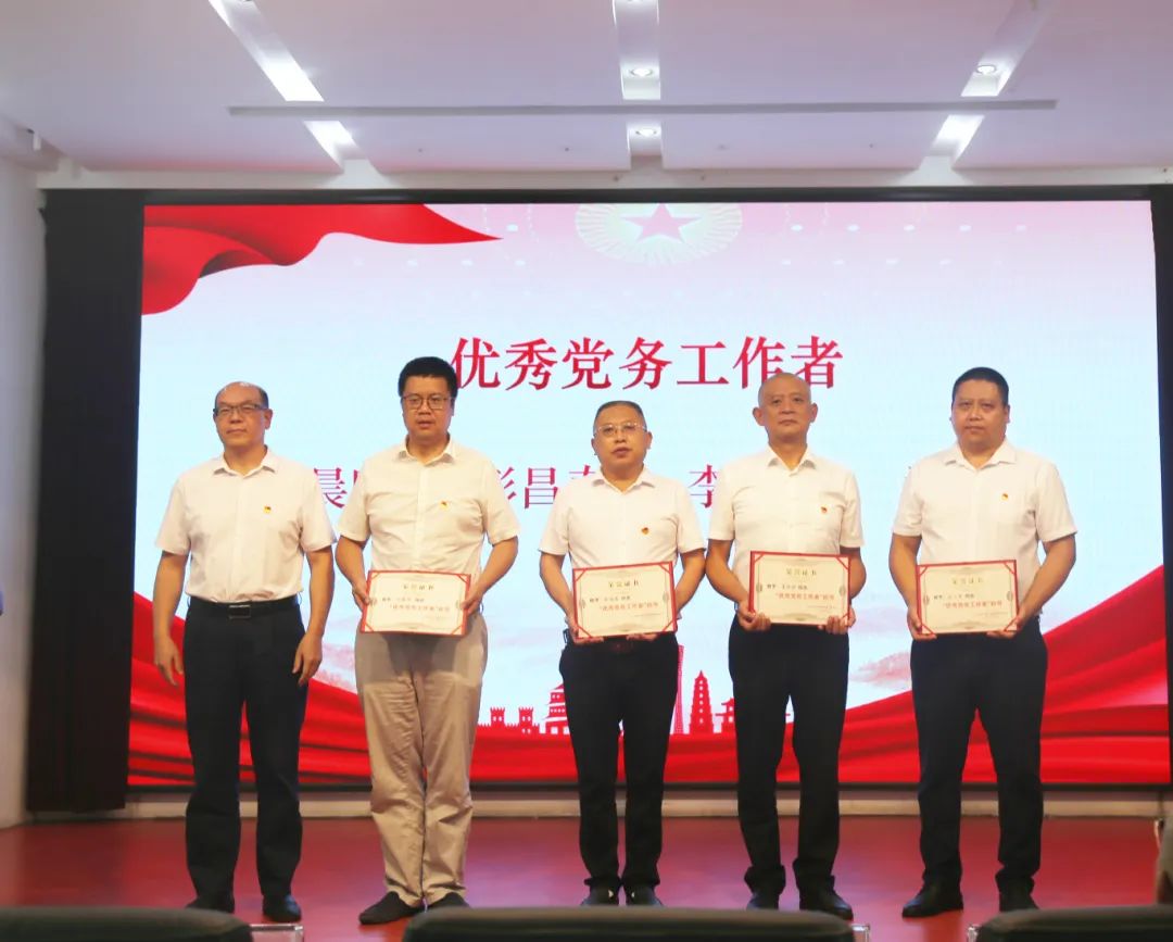 黨委書記曾紅彪為優(yōu)秀黨務(wù)工作者肖晨暉、彭昌春、李東國、沈小軍頒獎(jiǎng)