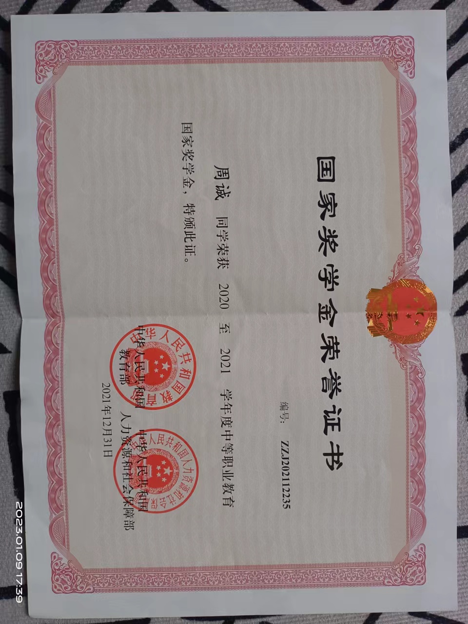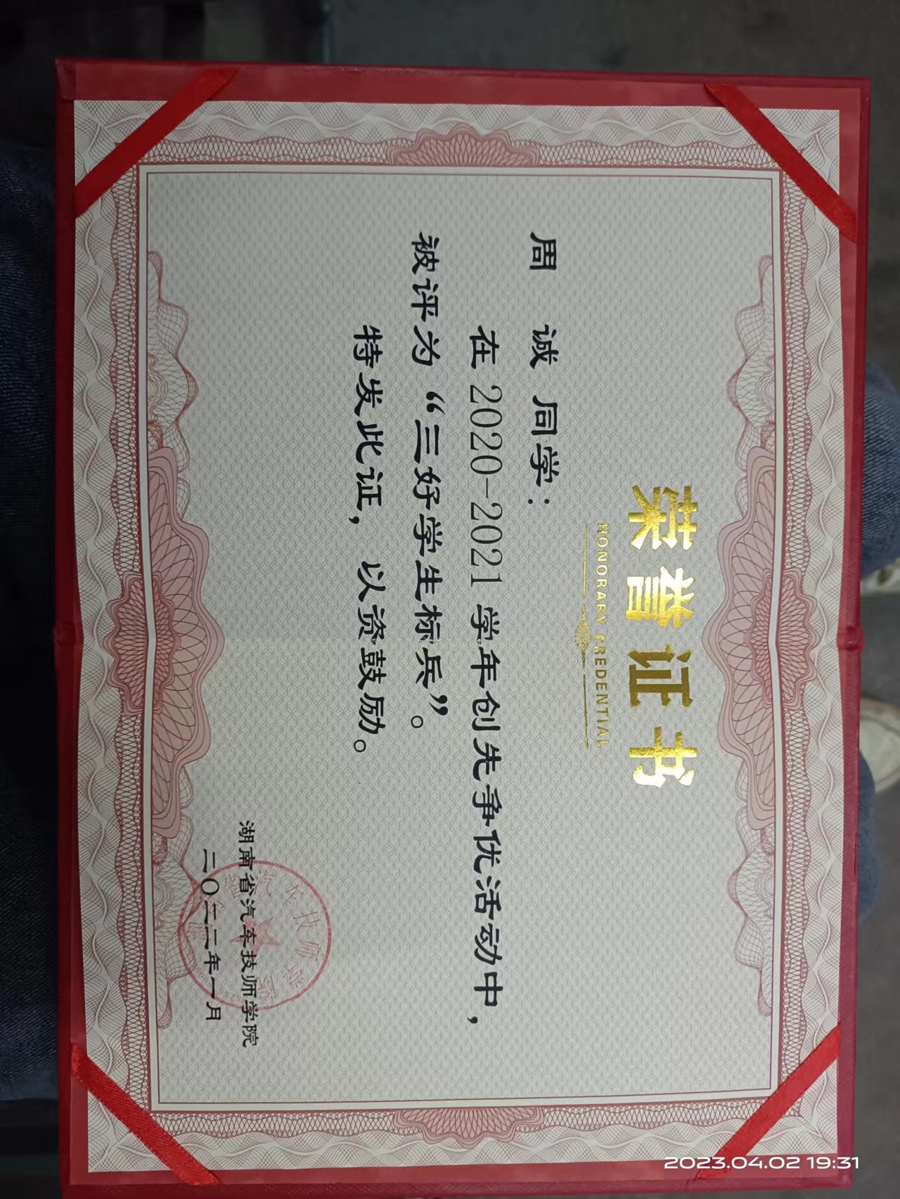 周誠學(xué)習(xí)目的明確,刻苦努力,注重拓寬自己的專業(yè)知識(shí)結(jié)構(gòu),經(jīng)常與老師和同學(xué)探討專業(yè)知識(shí),認(rèn)真學(xué)習(xí)好每門專業(yè)課,打下了扎實(shí)的專業(yè)基礎(chǔ)。他善于營造良好的學(xué)習(xí)氛圍,起到了模范帶頭作用,曾多次參加市級(jí)及學(xué)院技能競賽,并取得了優(yōu)異的成績,并獲得2020—2021學(xué)年度“國家獎(jiǎng)學(xué)金”獎(jiǎng)勵(lì)。