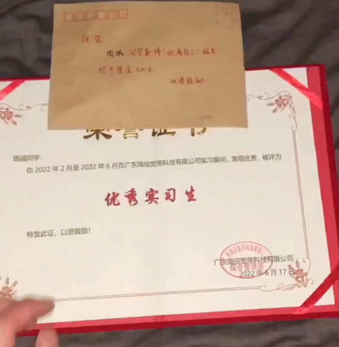 2022年6月,廣東海信寬帶科技有限公司“優(yōu)秀實(shí)習(xí)生”稱號(hào)。