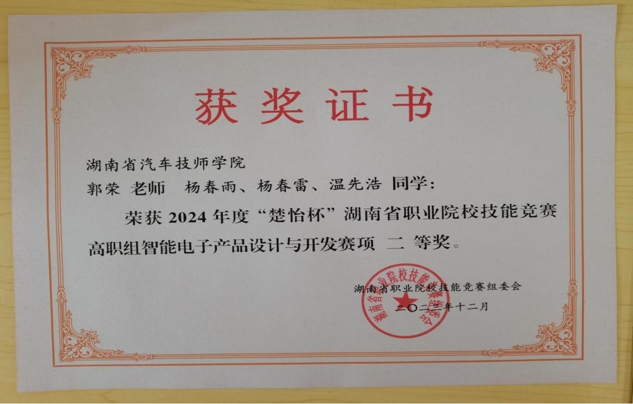 12月16日,2024年“楚怡杯”湖南省職業(yè)院校技能大賽高職組智能電子產(chǎn)品設(shè)計及開發(fā)賽項在湖南工業(yè)職業(yè)技術(shù)學(xué)院舉行,共有來自全省的64支隊伍、共256名選手同臺競技。由湖南省汽車技師學(xué)院長沙分校郭榮老師和學(xué)生楊春雨、楊春雷、溫先浩4人組成的師生參賽團隊經(jīng)過一天的激烈角逐,勇奪該賽項團體二等獎。作為第一次參加該賽項比賽的隊伍,首次參加就取得了驕人的成績。