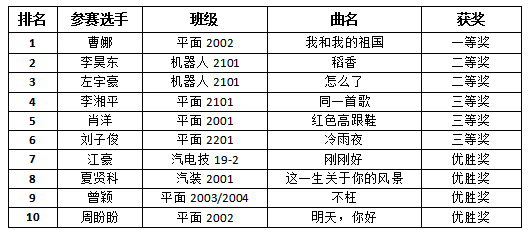 本次校園”十佳歌手“大賽分為初賽,復(fù)賽和決賽三個(gè)部分,歷時(shí)近一個(gè)月。經(jīng)過班級(jí)初賽推選,共有80多名學(xué)生進(jìn)入復(fù)賽,再經(jīng)過一輪篩選,共有13名選手脫穎而出,進(jìn)入決賽。他們利用課余時(shí)間認(rèn)真準(zhǔn)備,多次排練,力爭取得好的成績。決賽的舞臺(tái)上,他們盡情散發(fā)著自己的魅力,用嘹亮的歌聲感染著現(xiàn)場每一個(gè)人。通過激烈的比拼,最終曹娜、李昊東、左宇豪、李湘平、肖洋、劉子俊、江豪、夏賢科、曾穎、周盼盼榮獲校園“十佳歌手”稱號(hào)。