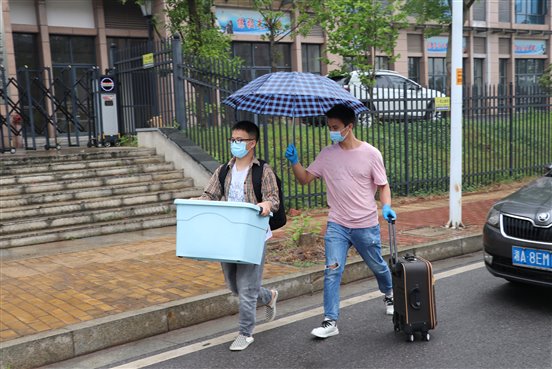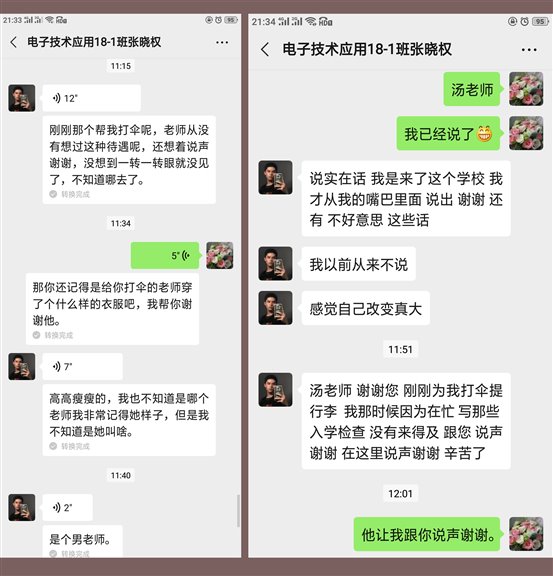 為防止學生們因突變的天氣感染風寒,分校的志愿者們也忙碌在復學返校的前線,搬行李,打雨傘,電子技應用術18-1班的張曉權同學還特意發(fā)來微信,向幫他打傘的老師真誠的道謝。好久不見,孩子們成長了。