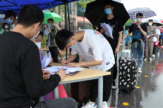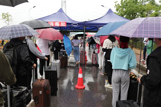 天公不作美,但值班工作人員“任憑風吹雨打,我仍堅守崗位”,一句句“老師,好久不見”,“老師,我想你們了”,暖流浸入心扉,再苦再累也要鑄成鋼鐵一般的防疫長城。